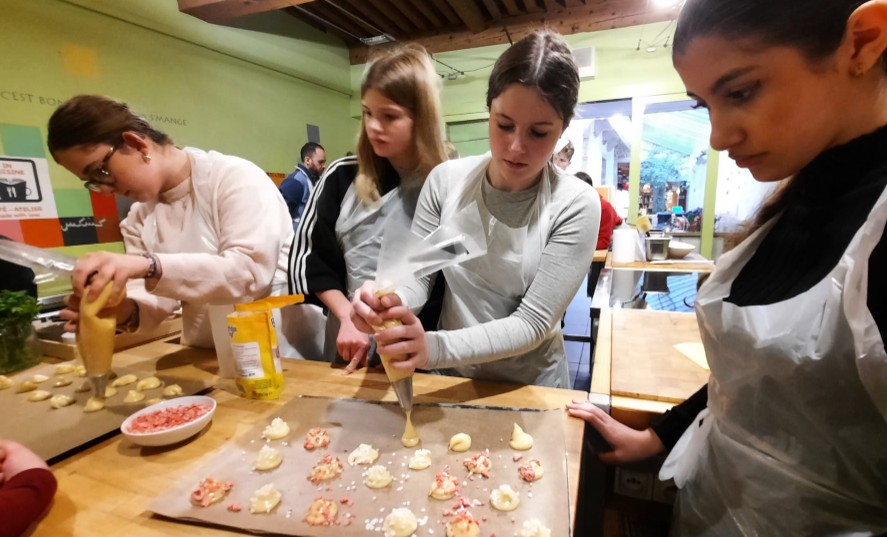 Après la nourriture culturelle, les élèves ont mis la main à la pâte à l’occasion d’un cours de cuisine. Ils ont préparé des choux à la crème et des gougères au fromage, accompagnés d'une spécialité au nom étrange pour les Allemands : la « cervelle de canut », un fromage frais agrémenté d'oignons et d'herbes aromatiques, originaire de Lyon, ancien bastion du tissage de la soie. Un artisanat, où même un ancêtre de Goethe a fait fortune dans la capitale des Gaules, ce que les élèves ont appris lors d’une visite dans la vieille ville.