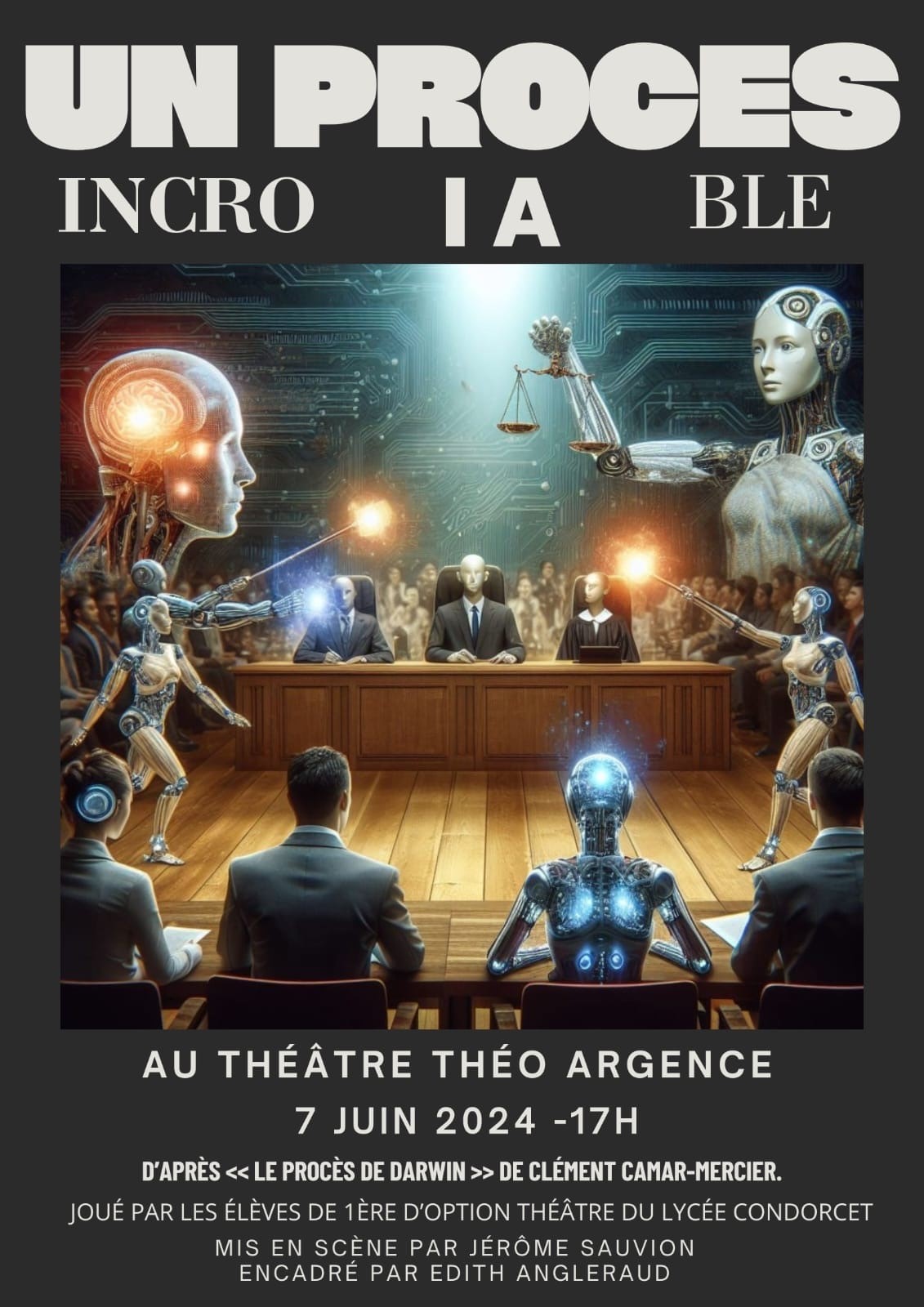 En lien avec le thème "la salle et la scène" proposé au programme ministériel de l'option théâtre, les seize élèves de Premières prennent le public comme jury dans un procès de l'I A , à partir de la pièce Le procès de Darwin de Camard-Mercier réactualisée par des publicités en inter-scènes inventées par les élèves et un final qu'ils ont ré-écrit. Un accompagnement sonore et musical modeste est assumé en direct sur scène par Loren.