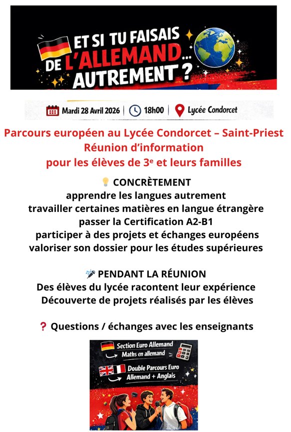 Une réunion d’information à destination des élèves de 3ᵉ et de leurs familles se tiendra mardi 28 avril 2026 à 18h au lycée.