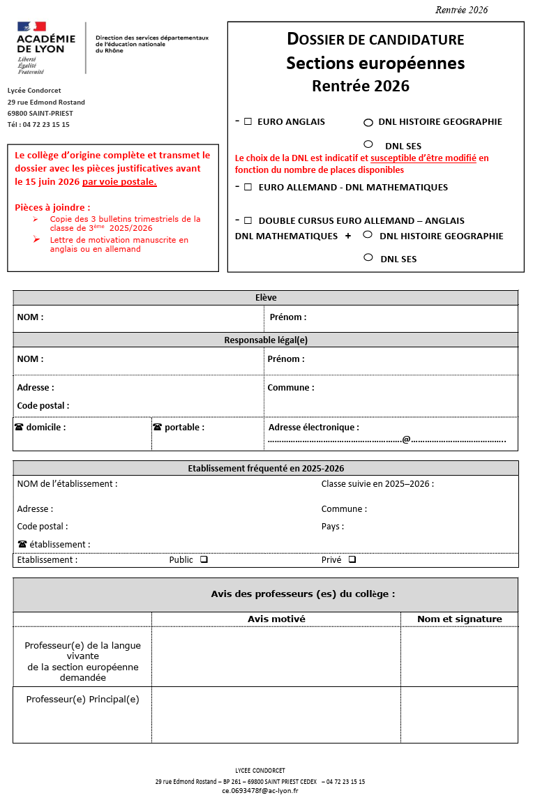 Sections européennes : dossier inscription